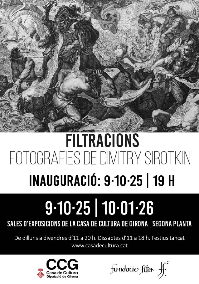 Dmitry Sirotkin presenta, a la Casa de Cultura de Girona, el projecte «Filtracions». El fotògraf i artista contemporani de Sant Petersburg Dmitry Sirotkin, que exposa i treballa a l’Hermitage, és també dissenyador de llibres, membre de la Unió d’Artistes de Rússia i forma part de l’equip del Museu Estatal de l’Hermitage. La seva obra explora grans temàtiques com la formació de la personalitat, la continuïtat generacional i el futur de la civilització moderna, utilitzant no només la fotografia, sinó també el vídeo, els collages, el grafisme, els objectes i les instal·lacions.